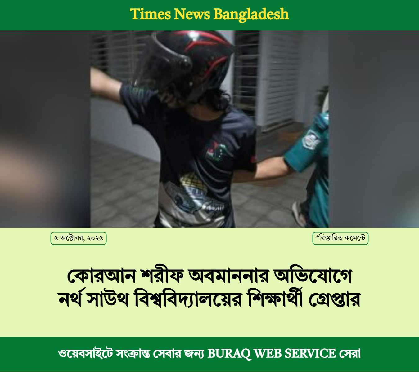 রাজধানীর নর্থ সাউথ বিশ্ববিদ্যালয়ের এক শিক্ষার্থীকে কোরআন শরীফ অবমাননার গুরুতর অভিযোগে গ্রেপ্তার করেছে ভাটারা থানা পুলিশ। এই ঘটনাটি দেশজুড়ে ধর্মপ্রাণ মানুষের মধ্যে ব্যাপক ক্ষোভ ও আলোচনার জন্ম দিয়েছে। গতকাল শনিবার (৪ অক্টোবর) মধ্যরাতে রাজধানীর একটি আবাসিক এলাকা থেকে অভিযুক্ত শিক্ষার্থী অপূর্ব পালকে আটক করা হয়।**